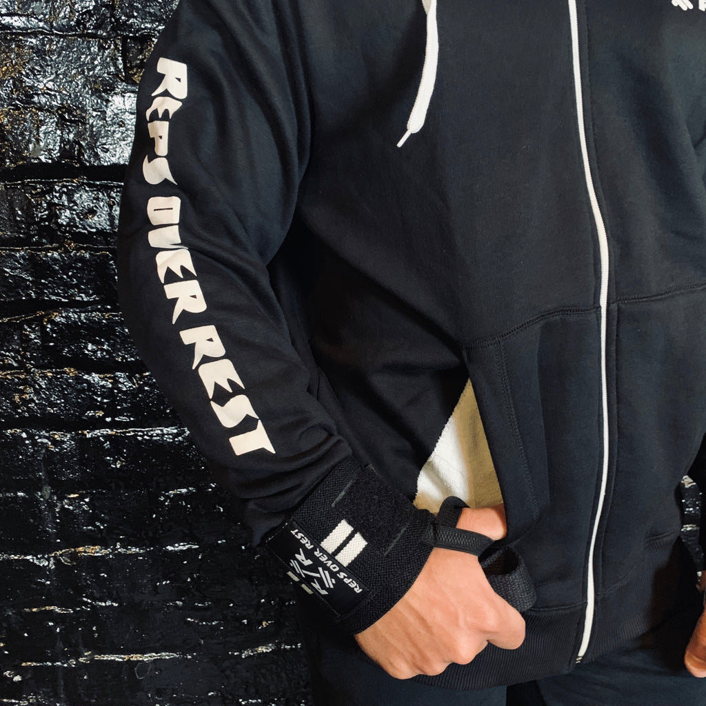 Think about the last time you washed your wraps and straps? Or how often you leave your towels all over machines and benches? Now, you can wipe sweat and chalk off your hands in between sets with the towel built right into the hoodie!