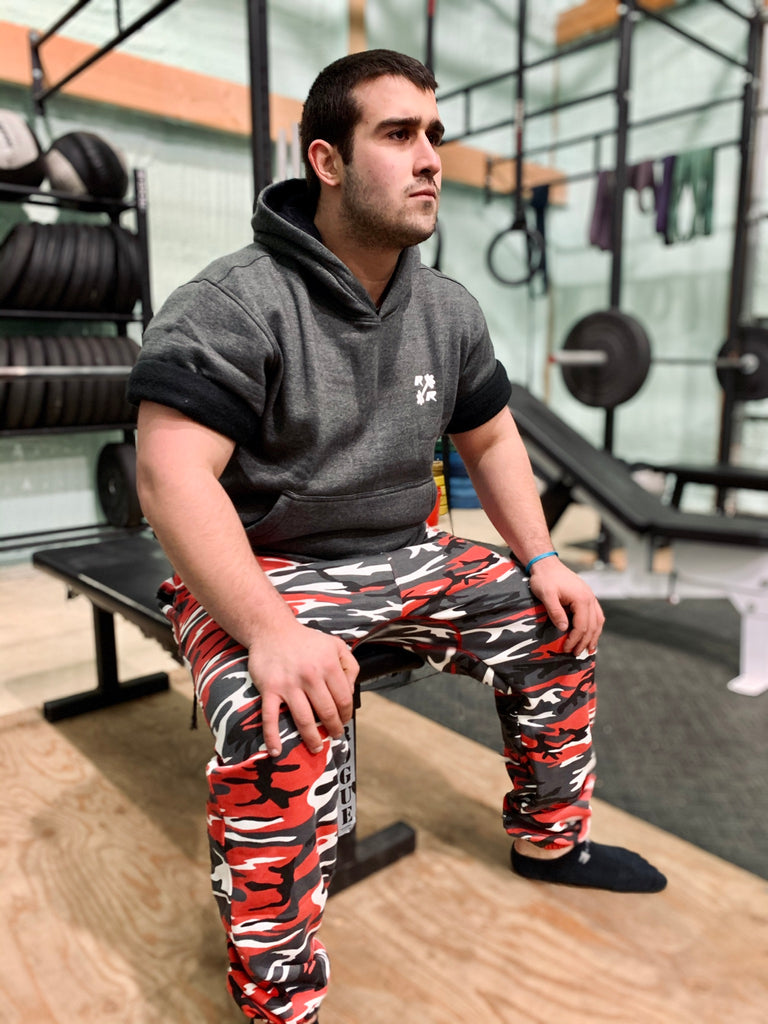 Our fleece lined, hooded, short sleeve hoodies are not only something you can’t find anywhere else but they have sport towels BUILT-IN to your pocket and hood so you can wipe sweat and chalk off in between sets and cardio.
