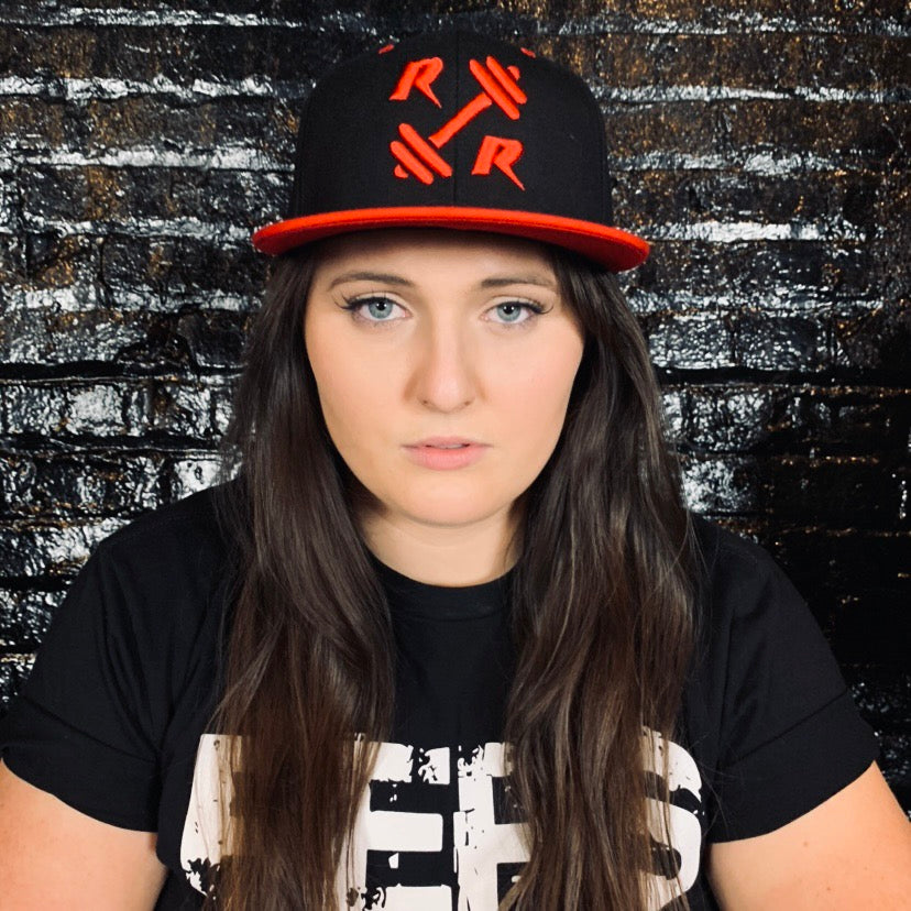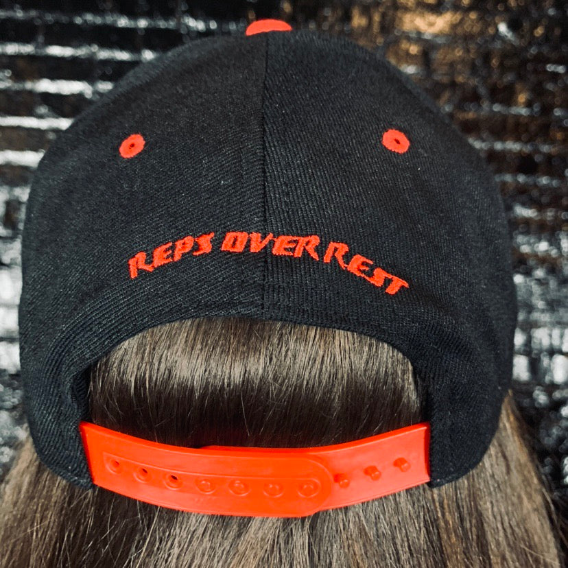 Reps Over Rest embroidered brand name in red thread curved on back.